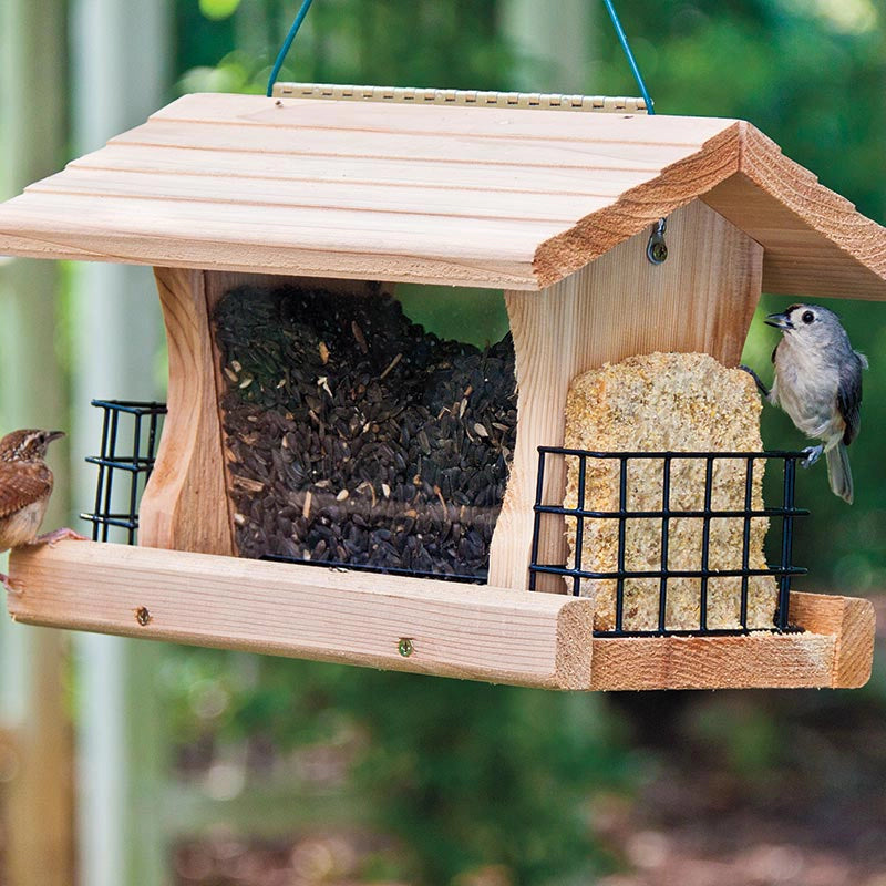 Offering both seed and suet and accommodating both perchers and clingers, this feeder lets you attract a wide variety of birds; besides Nuthatches, you'll see Woodpeckers, Chickadees, Titmice, Cardinals, Tanagers, Grosbeaks and Wood Thrushes, depending on your food. Handcrafted of long-lasting cedar, it holds a generous 4 quarts of seed in the Plexiglas® bin, and two standard-size suet cakes in the wire cages. Seed, suet and feeding birds keep dry under the overhanging roof, which flips open for easy filling and cleaning. The 9-1/2" cord makes it easy to hang. Excellent workmanship and materials mean you and the birds will enjoy this feeder for years! Measures 9-1/4" H x 13" W x 7 - 3/4" D.