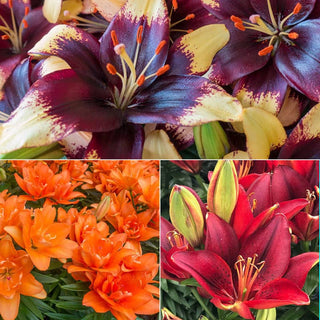 Put something different along a garden path with compact carpet lilies. These three from the 'Lily Looks™' series have all the style and grace of full sized lilies, but only grow about 1' tall. That's just right for a decorative container. Plus, while their blooms aren't small at about 4" across, the stems are short enough so you won't need to stake them to keep them facing upwards. They also make easy cut-flower bouquets without leaving a big hole in your garden design. With their extraordinary colors and strong, easy performances, you'd be hard-pressed to find a better way to fill small spaces. Lilium Asiatic 'Tiny Epic,' PPAF 'Tiny Double You' PP22875, 'Tiny Rocket' PP24500