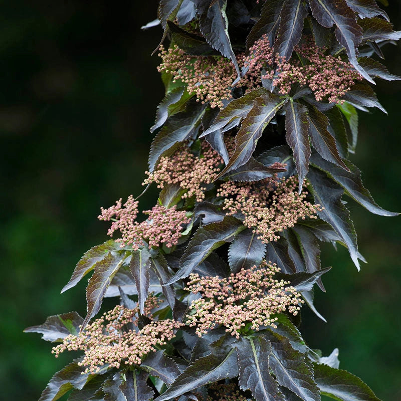 Elderberry plants have grown in popularity in recent years—and for good reason. These lovely shrubs produce intensely flavorful fruits with rich, woodsy flavor, often used for making jams, syrups, and jellies. In addition to their berry yield, elderberries are simply beautiful. Black Tower offers the signature color palette, pollinator-attracting flowers, and tasty fruit of any elderberry, in a neat and upright habit. The foliage opens in celery-green in spring, maturing to a dark burgundy along near-black stems. Flowers attract butterflies, too. This shrub is self-pollinating, but planting multiple varieties can increase yield.