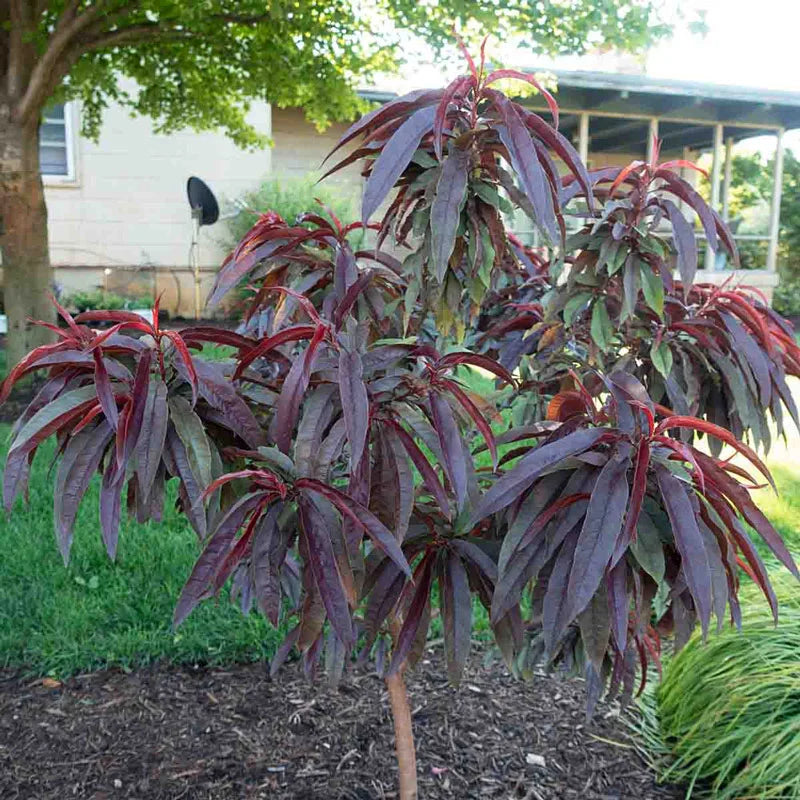 Bring reliable, high-impact color to tight spaces or garden beds with Bonfire Patio Peach. This dwarf ornamental peach reaches about 5 feet tall and wide, creating a tidy focal point without crowding nearby plants. In very early spring, the branches carry showy double pink to pink-red blossoms. As the season progresses, dark red foliage holds its rich color, adding depth and contrast long after bloom time. Use one as a statement in a large container or plant several along a path for a finished, coordinated look.
