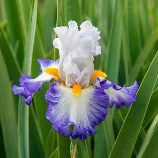 Bold, Exciting Color Contrast: This iris is perfect for creating a stunning visual display, whether planted en masse for a dramatic effect or mixed with other perennials for a layered, textured look. The pristine white flower with bright blue edging along its lower petals is set against a golden yellow-orange beard, drawing the eye and adding depth to your garden's color palette.