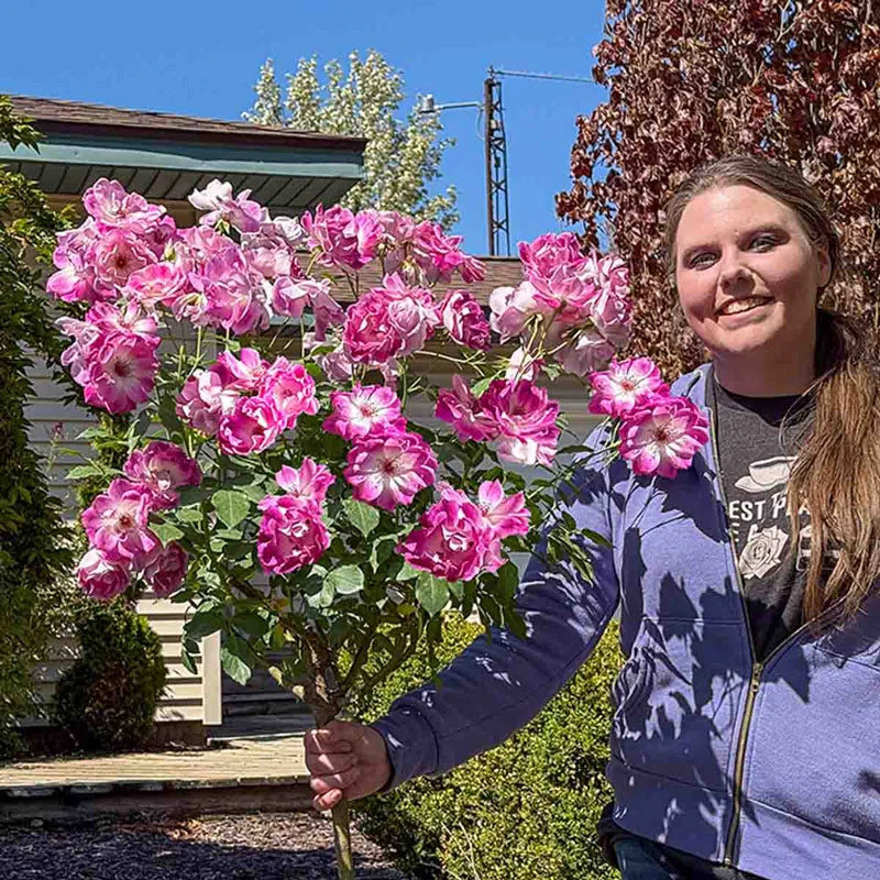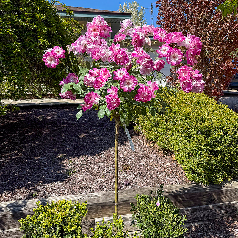 A vibrant version of the popular variety, Iceberg, this bright hand-painted pink and white tree rose exhibits the same prolific flower production and showy clusters of 4" flowers as its famous parent. Brilliant Pink Iceberg has a mild honey fragrance and creates a constant show of beautiful color all season long. It looks elegant when planted in rows, at the entrance to a home, in space-challenged gardens and even containers. Tree roses are created by grafting roses onto a central cane and have a spray of rose blooms and foliage atop a central support. Rosa hybrida 'PRObril. PP 12645