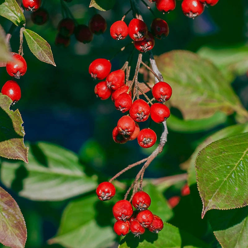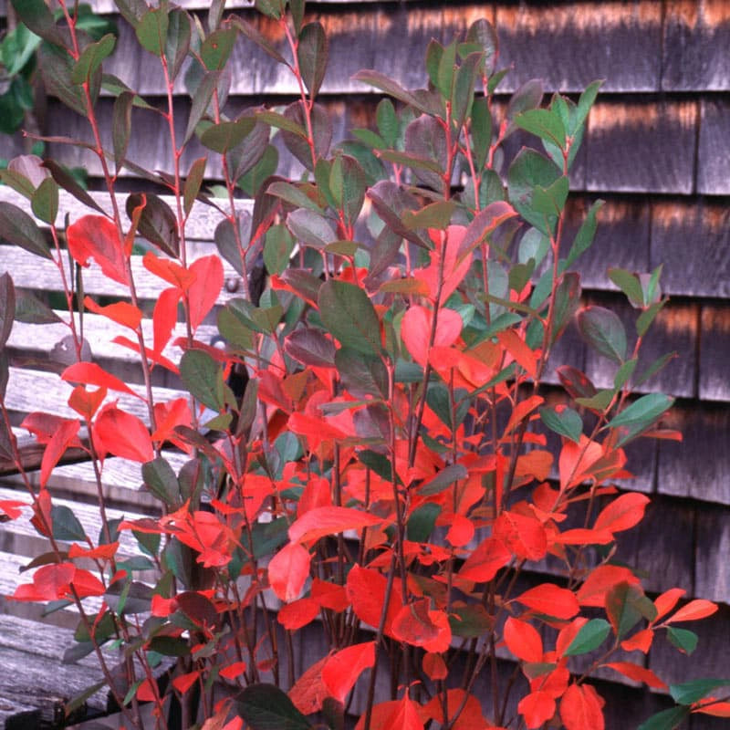 A celebration in color and texture, Brilliantissima has a different feature for each season. In late spring, it's thick with white (or sometimes pink) flowers. They're followed by glossy red berries, which are larger and in higher abundance than traditional chokeberries produce. In fall, the leaves turn brilliant red, which looks amazing below colorful fall trees and brightens up landscapes that need a little autumn flair. Brilliantissima is more compact, growing up to 6-8' in maturity and spreading around 3-4'. It's a gorgeous focal point, and it spices up a hedgerow. Aronia arbutifolia 'Brilliantissima'