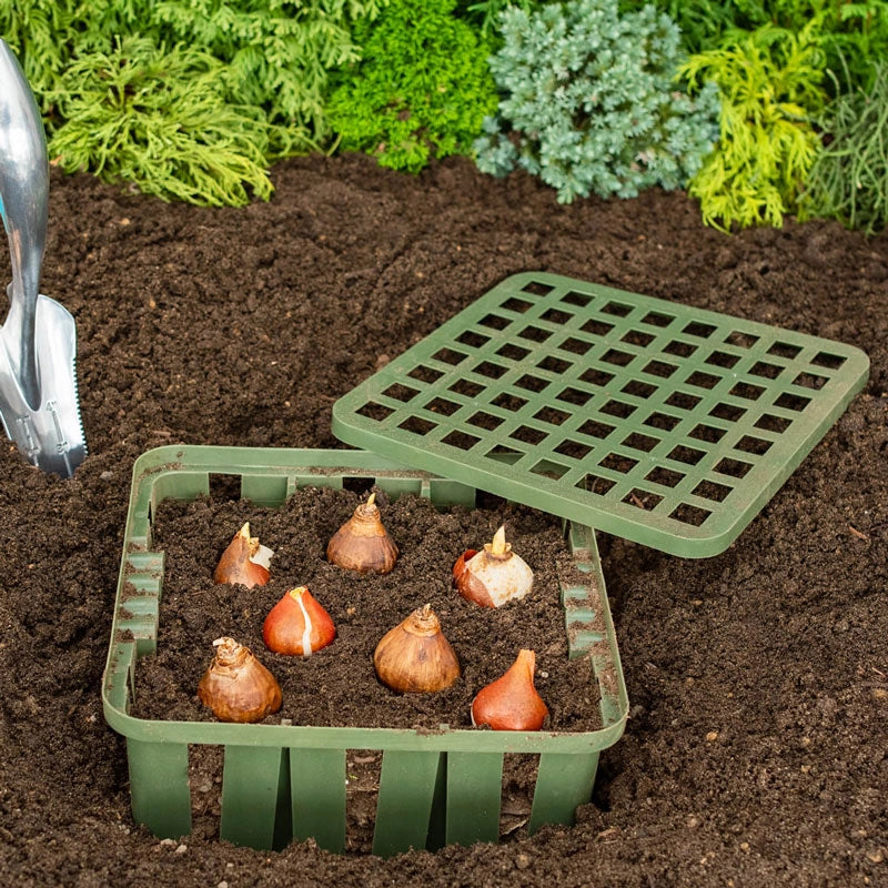 We know. After carefully designing your perfect bulb garden and planting everything just right… there is nothing worse than a squirrel digging up and nibbling everything to bits. Defend your prized bulb planting with the Bulb Basket Kit. Inconspicuous in green, this basket is large enough for even the big tulip bulbs. It's constructed from durable plastic, with holes so the stems can grow out but the rodents can't get in. It's convenient when planting, because it has marked depth lines. It also helps with tender summer bulbs like dahlias, calla lilies and gladiolus. Those need to be carefully lifted in fall in most zones. This basket has recessed handles, so you can simply pull up the full planting, no problem. 6"H, 10"W, 10"D
