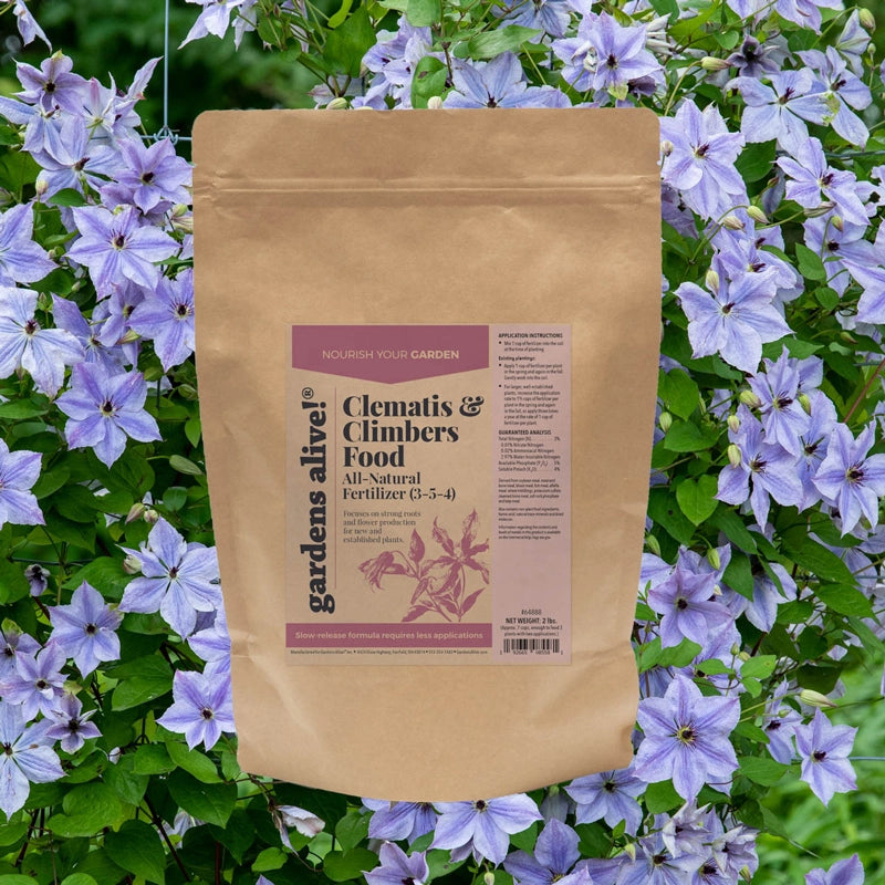 Your goal is to grow a healthy, happy, productive plant, so your first thought is to give it some food. Great! But if you grab a basic high-nitrogen fertilizer, you'll just be encouraging a whole lot of leaves. With Clematis and other climbers, you really want root growth and flower development. Roots for health and strength, and flowers (obviously) for beauty. That's why we offer a specifically formulated Clematis and Climbers Food 3-5-4, which is so much better for your vines than the average garden center formula. If you want to know a bit of the science, the nitrogen (the first number, N, in the NPK formula, which is 3 in our 3-5-4 formula) is lower, and there's much more available phosphorus (the second number, P, in the NPK formula, which is 5 in our 3-5-4 formula). That ratio of nitrogen and phosphorus will encourage well-developed root systems and vivid, abundant flowers. This is a slow-release formula, so you won't need to apply it so often. We suggest one application in spring and fall, plus mixing an application into the soil when you first plant a new climber.