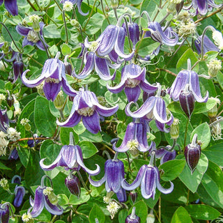 Matte, deep–purple sepals frosted with white edges open in a gentle recurve. You'll enjoy the prolific flowering of Fascination as well as its form. Shaggy, wheaten–colored centers add even more texture to this enthralling Clematis. Fascination loves to sprawl, but won't mind being gently clipped in if you desire a more vertical flower display. Fascination is a non–vining Clematis but will grasp a structure, for a more vertical container or retaining wall display, if encouraged by gently clipping it up. This unique hybrid is always in limited supply, so don't miss out on these elegant and interesting purple bells. A medium plant with small flowers and lots of elegance. Clematis 'Fascination'