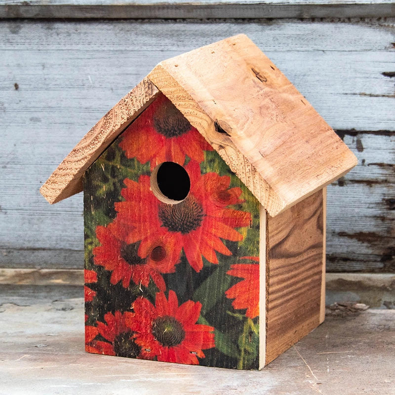 These darling wren houses are printed with striking floral images from Spring Hill Nurseries® photographer, Jen Nova. Now the same beautiful art that inspires gardeners on our website and in our catalogs will delight in your home garden. Choose from bright red coneflowers and cheery yellow–and–red coreopsis. The small entry hole and cozy size is just right for little birds like wrens, chickadees and nuthatches. The house is made of cedar, which is a softer wood and easier for young birds to grip. It's also a sturdy, long lasting material. A metal panel on the back allows for easy access when it's time to clean at the end of the season. There is also a small hook on the back to hang your birdhouse. If your environment is prone to harsh weather conditions, you may want to protect this house with a clear urethane coating. This quality birdhouse is made in the U.S.A., in a Sheltered Workshop by Scenic River Industries. Here, individuals with physical, mental and emotional impairments can enjoy fulfilling, stable employment, crafting beautiful products such as these birdhouses. H9¼"xW7½"xD7"