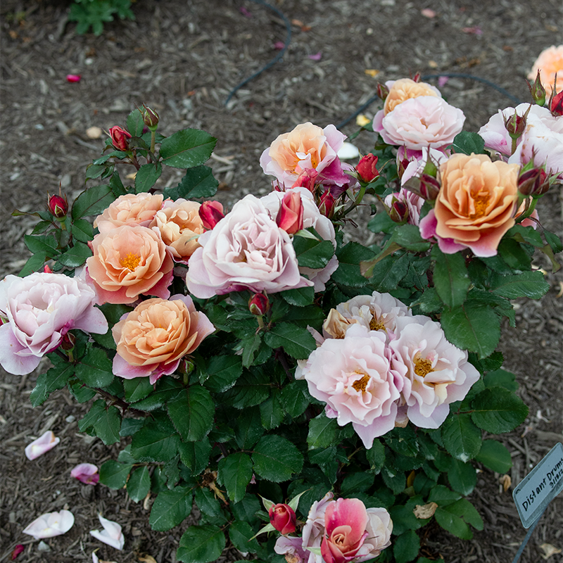 You'll adore the ombre effect of the uniquely colored blooms that leaves each large, 4" flowerhead looking a bit different from the other. These cupped, fully double blooms, which feature more than two dozen ruffled petals, grow in clusters and put on a remarkable floral display. Their fragrance is intoxicating and spicy sweet, and reminiscent of myrrh. As a result, the blooms stun as a cut flower in both appearance and scent. Your senses will relish Distant Drums' penchant for blooming throughout the summer months. The dark foliage produced by its upright, bushy habit further enhances the striking beauty of this rose in bloom. Grow it in a border or container. Rosa 'Distant Drums'