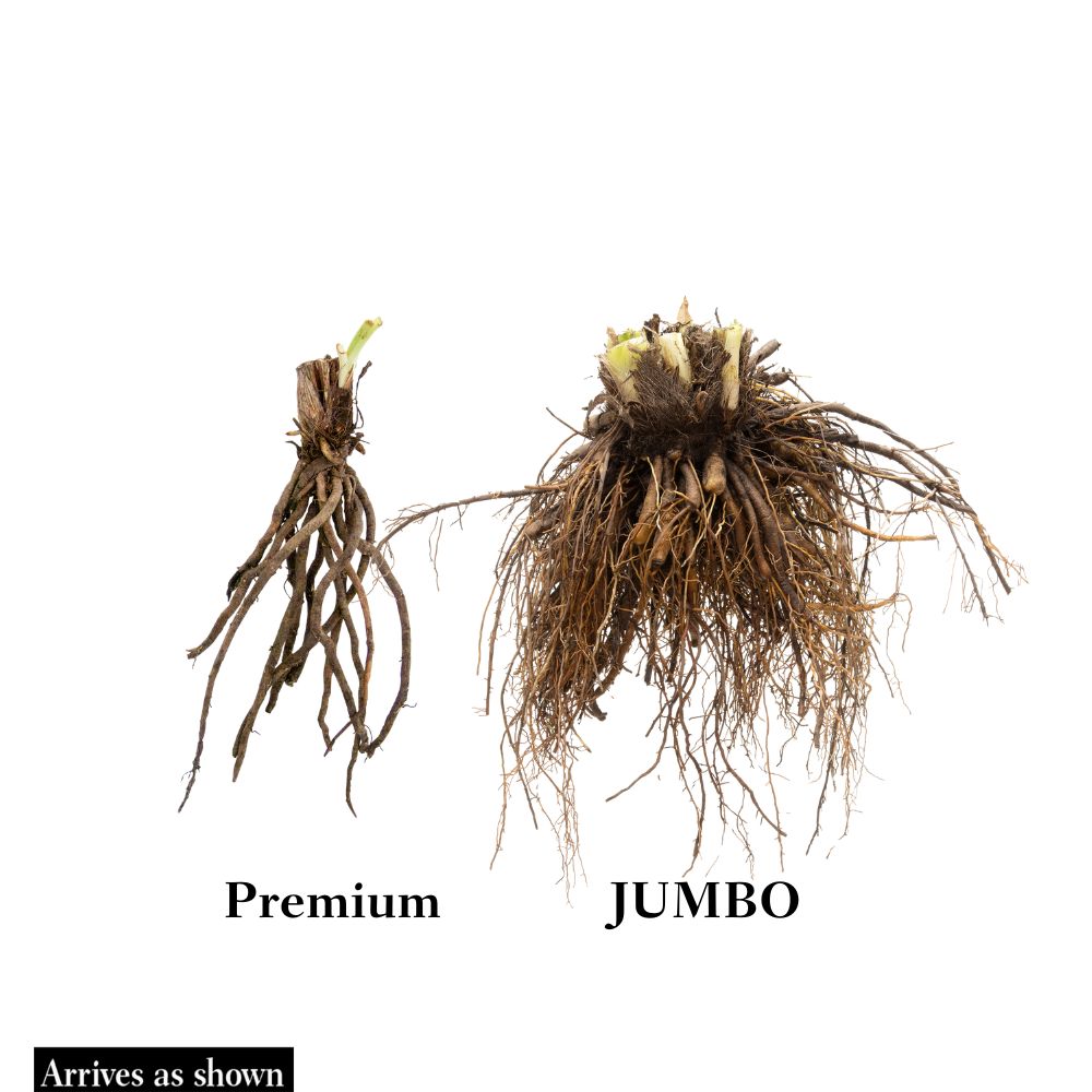 This daylily is available in a Jumbo Bareroot size. Ideal for gardeners who hate to wait, jumbo bareroots have a considerable head start over our standard #1 size.