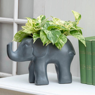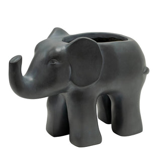 We were impressed by the quality of this planter, it really looks like it's made from stone, although it's actually a lighter, durable polyresin. We just can't help imagining this one in the home library of a world traveler, put high on a bookcase with a cascading plant draped over the edge and tumbling down the shelves. Or you can put it on a side table and give it something upright and flowering to carry. It also can be used outdoors and makes the perfect whimsical centerpiece on a patio table. We call this planter "Good Fortune" because the elephant has its trunk up. Depictions of elephants with their trunks up are meant to bring good luck. 18"Hx10"Wx14"L.