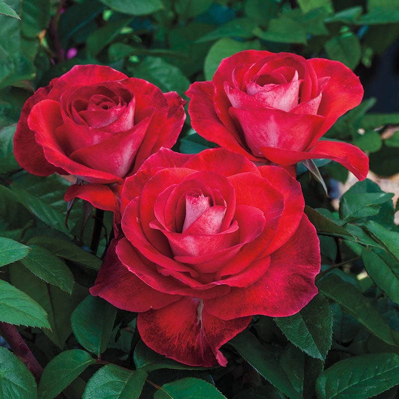 A flower color unlike any you've seen before—the dark orange petals have a white reverse and when the weather cools, smoky purple shades overtake it. This unusual color-change effect is a surefire way to shake up your fall garden, and since we've cultivated a selection of exclusive jumbo-size bareroots, you can have that striking fall display in the very first year. These bareroots have thicker branches and roots, which allow them to form a rounded shrub with at least twice the blooms as the industry's premium #1 bareroot could produce in its first year. Then, it will continue to mature into a handsome, even and upright bush that won't get spiky. The foliage is unique, too, appearing in a complementary shade of dark green and covering the plant all the way to the ground. As a hybrid tea rose, this variety makes excellent cut flowers, which carry a lovely perfume of tea and spices. Quantities of Smokin' Hot in our jumbo size are very limited. Rosa 'WEKmopaga' PPAF