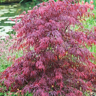 Looking for the impact of a Japanese maple, in a small space? Inaba Shidare Japanese Maple adds the elegance of Japanese gardening to any location. Measuring only ten feet in height at maturity, the cascading branches of this small Japanese Maple tree can spread up to twelve feet in width. The harmony of smooth bark and intricate, lace-like foliage stand out on the well-branched form of tree. Foliage emerges deep purple in springtime, maturing to a purple-red color and ending the season in firey bright tones. A colorful, low-maintenance tree, Inaba Shidare makes an excellent specimen or street tree, and is unbothered by black walnut trees nearby. Acer palmatum var. dissectum 'Inaba Shidare'