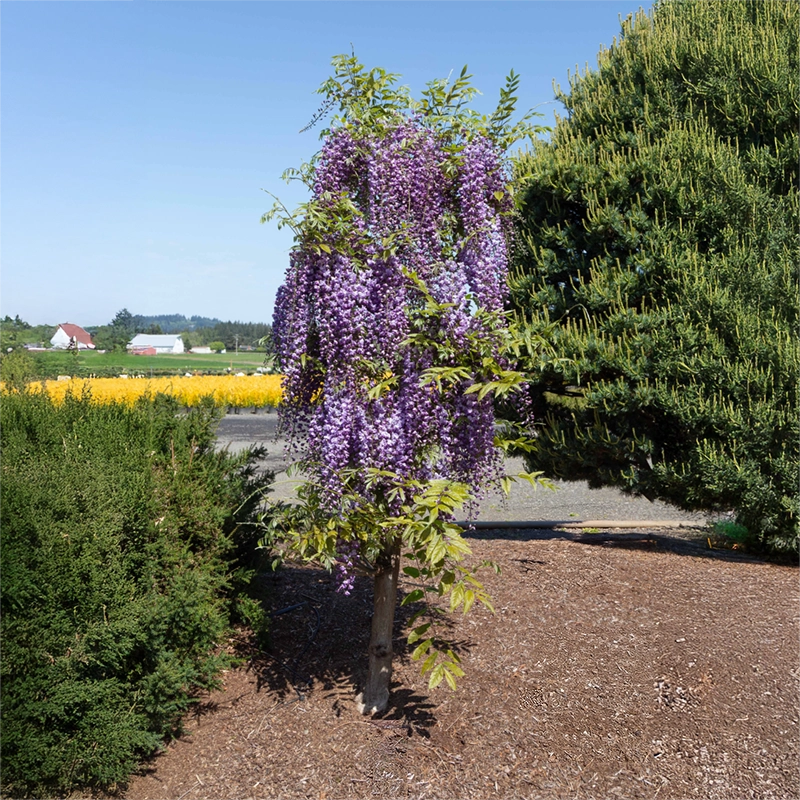 What brings more character to a home than beautiful, draping, perfumed wisteria? These perennial vines already have the power to command attention and make a garden stand out. But, Grande Diva® Jessye Wisteria, named after world-renowned opera diva, Jessye Norman, is your key to a garden design like no other. Grande Diva® Jessye is brand new and comes to us from our friends at Pepinieres Minier in France. Spring Hill is one of very few places you'll be able to find it on the market. The bold look of Jessye includes a regal mélange of purple, double flowers tightly packed along the racemes. These racemes reach up to 12" long, hanging down nicely from an arch or pergola. You'll really get that draping effect, with precious flowers raining down above your head. Like any wisteria, Jessye grows with strong, woody, curving branches. You can train it up a wall--right around a window you'd like to open for fragrant breezes, over a strong structure or keep it as a standard in your garden border. Use its bushy habit as privacy by training it along a fence or add curb appeal in a quiet front yard. Wisteria floribunda 'MinwiCB02'