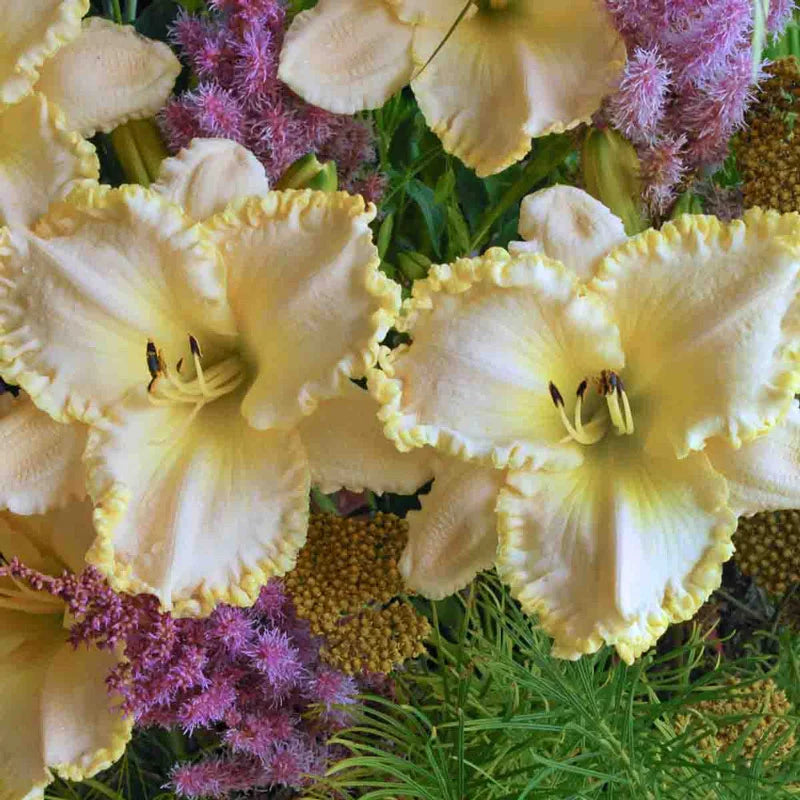 Each bloom opens to creamy petals with golden throats and gentle ruffling along every edge. The texture and subtle color shifts—peach on cloudy days, sparkling diamond dust in the sun—create a sense of depth and detail rarely found in hardy perennials.