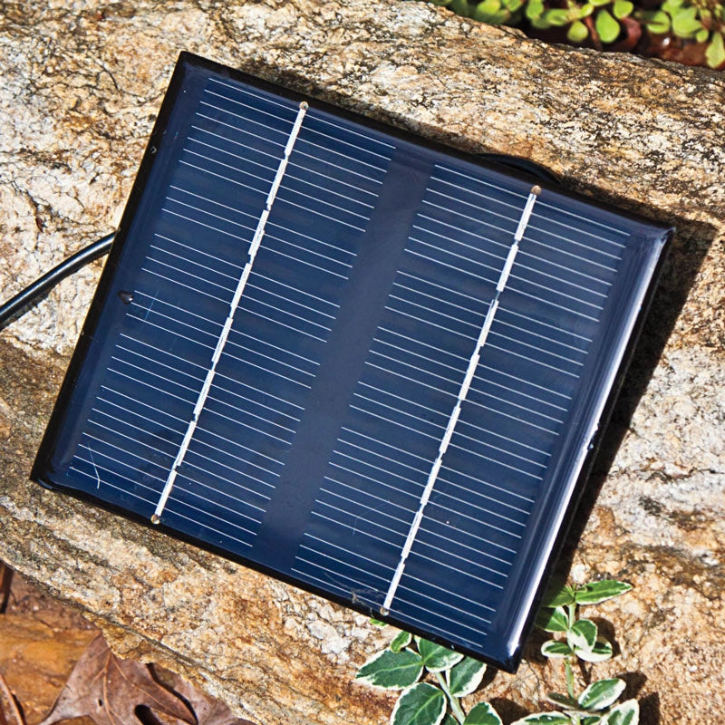 Our Mini Solar Fountain provides a refreshing spray that will attract birds, while aerating the water to keep it cleaner. It comes with a solar pump and three different fountain heads. A 128-inch cord allows the solar panel to be in the sun while the bird bath is in another location. No operating costs! The pump works only in sunlight; it measures 5" high, with a base 2" wide and 1 7/8" deep. Solar panel is 5" x 5 7/8". Birdbath not included.