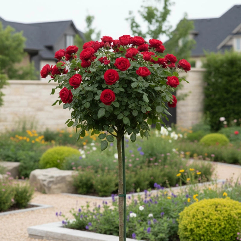 Unlike traditional shrub roses that grow from the base up, tree roses—also known as grafted standard roses—are specially cultivated by grafting a rose variety onto a sturdy, 2–3-foot tall trunk of rose rootstock. This horticultural technique allows favorite floribunda, grandiflora, hybrid tea, or even climbing rose varieties to take on an elegant tree-like form. The result is a dramatic garden feature: a vertical accent that elevates lush, colorful blooms to near eye level. Tree roses offer a refined structure and bring added dimension to flower beds, borders, and containers alike.