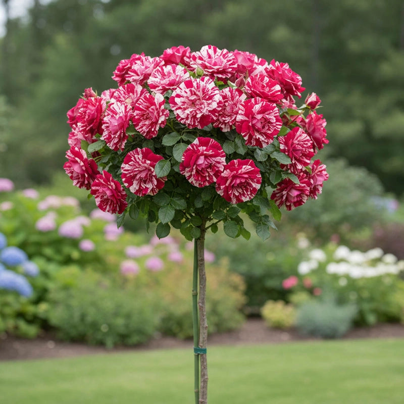 Unlike traditional shrub roses that grow from the base up, tree roses—also known as grafted standard roses—are specially cultivated by grafting a rose variety onto a sturdy, 2–3-foot tall trunk of rose rootstock. This horticultural technique allows favorite floribunda, grandiflora, hybrid tea, or even climbing rose varieties to take on an elegant tree-like form. The result is a dramatic garden feature: a vertical accent that elevates lush, colorful blooms to near eye level. Tree roses offer a refined structure and bring added dimension to flower beds, borders, and containers alike.