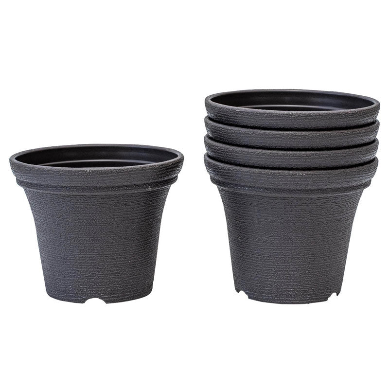 This display is for a 6" standard pot with a lip, as the lip will rest on top of the metal ring. Our Set of 5 Pots will fit perfectly into the Potted Wall Display. They have slots along the bottom for drainage, so if you're using them indoors, either line the pots or water them outdoors to avoid spills. These 6"" plastic pots are a simple, unobtrusive grey with some lovely texture on the surface, so they'll fit right in with a sophisticated garden design. You can also just buy the set of pots, because who doesn't need more basic pots? This set of 5 is useful for creating consistency through your container garden.