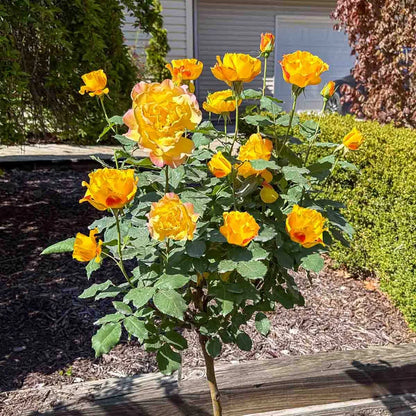 Elevated for added impact, Rio Samba Tree Rose offers a dazzling mix of gold and coral-red blooms that shift in tone with the season. Its fully double flowers appear early and keep coming, producing layer upon layer of vibrant color that lights up the landscape. With its floriferous habit and classic hybrid tea form, this tree rose is a natural showstopper in containers, entryways, or as a bold focal point in the garden—especially in cooler climates where its colors intensify beautifully.