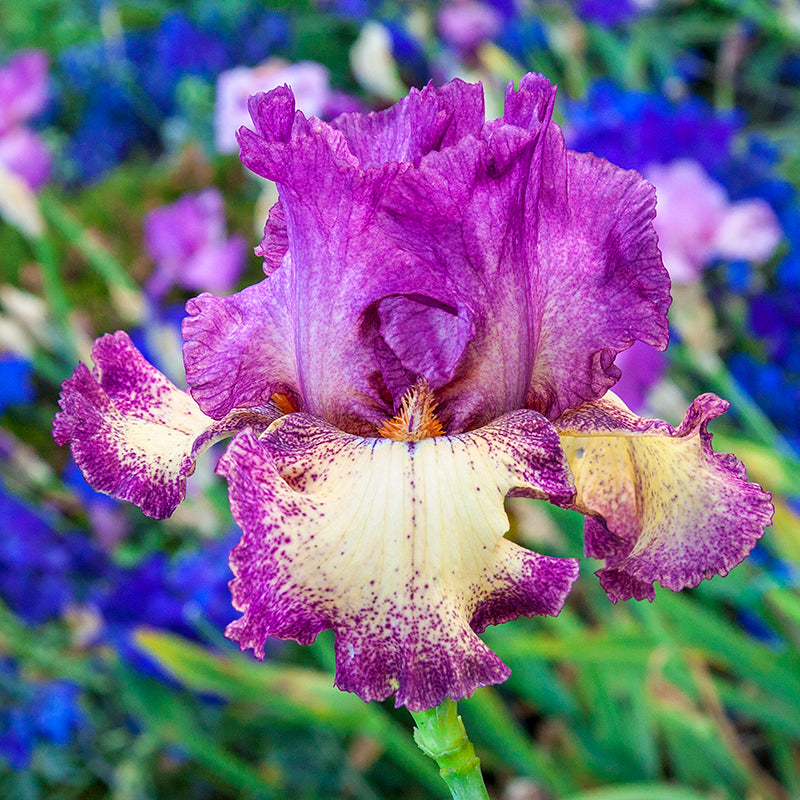 Light up the stage and your garden with Rock Star Reblooming Bearded Iris. This show-stopping performer can't be beaten for incredible plicata markings and sultry, show-ready patterns. Pale apricot falls are ruffled and heavily banded with rich raspberry-rose markings that match the color of the standards. At a height of 30 inches, Rock Star is the right height for the front of your iris beds, or perfect for highlighting your favorite walkway. This boisterous iris blooms in the early or mid-season, then provides an encore after the break in early fall. Iris germanica 'Rock Star'