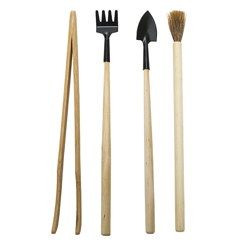 A terrarium is a great way to give indoor plants the humidity they need. And when you're trying to get the terrarium display to look just the way you pictured, you'll need the right tools for the job. This set includes a natural bristle brush, a custom rake, shovel and bamboo tongs. These small tools with long handles let you actually enjoy planting your terrarium, no more frustration from trying to move around small pieces with your bare hands. It'll match perfectly with our Complete Cloche Terrarium Kit, and if you're sending a terrarium as a gift, the tool kit makes a thoughtful add on. W4"xH14"xD1"