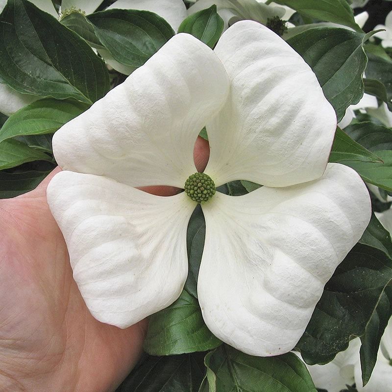 In spring to early summer, huge, pure white flowers bloom, then strawberry-like fruit and red foliage provide beautiful fall interest. Has outstanding winter hardiness, good drought and disease resistance. Grows 15-20' tall with a similar spread. Zones 5-9. 2-3' bareroot. Cornus x 'KN30-8' PP16309. Full sun to partial shade.