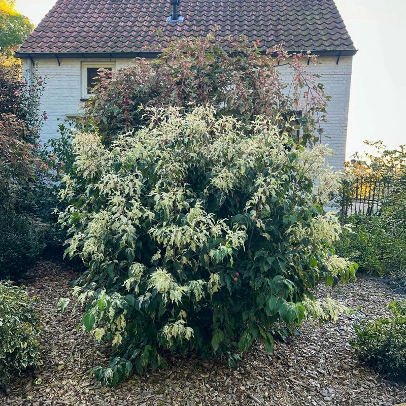 The Watermelon Sugar Dogwood is a true showpiece, celebrated for its ever-changing color and exceptional garden performance. Bred in The Netherlands, this unique variety begins the season with fresh green foliage that gradually develops creamy-white streaks and soft pink blushes; the result is a captivating tricolor effect reminiscent of the beloved dappled willow. As spring progresses, large star-shaped white flowers blanket the branches, followed by clusters of strawberry-red fruits that attract songbirds. In fall, the foliage deepens into rich red-purple tones, ensuring year-round interest and vibrant color at every stage.