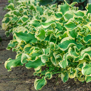 Attractive, ruffled foliage features creamy white margins that reach from tip to tail of each green leaf, even in the early stages of the plant. A medium-sized variety, Wheee! is perfect for filling in some of the smaller spaces between deciduous shrub-bery or along sun-dappled borders. Midsummer brings sprays of light lavender blooms. A hardy perennial with excellent slug resistance. Premium size. Hosta ‘Wheee!’ PP23565
