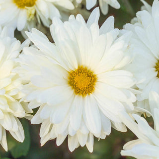Late-season gardens come alive with tidy, mounded plants covered in clear, white daisylike blooms. White Daisy Mammoth Mums create a lovely scene during the last weeks of summer and into fall, the time when most perennials have already faded away for the year. Developed by the University of Minnesota, these hardy mums withstand severe cold with ease. Enjoy rambling walks along sunny borders filled with bright white blossoms that herald the end of the growing season. To get the best from these lovely plants, plant them in groups of three to five in well-drained, humus-rich soil. They will grow reliably creating a lush display of texture and beauty near entries, in pots or along walkways.