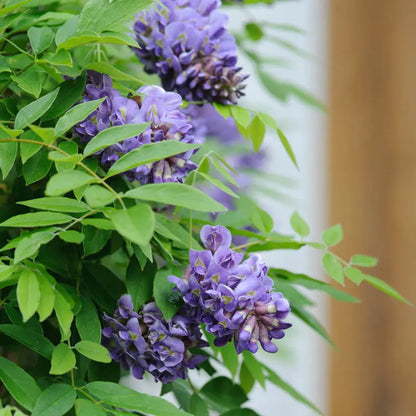 Amethyst Falls Wisteria is a charming and compact deciduous vine, beloved across its native United States for its stunning cascades of fragrant, lavender-blue flowers. Unlike its more vigorous Asian counterparts, Amethyst Falls is a native variety featuring a more restrained growth habit. Since Amethyst Falls won't take over the landscape, it is suitable for smaller gardens or confined spaces. Its leaves and flowers are smaller than those of Asian wisteria, but it is not quite a "dwarf" variety. Flowering on new wood, this wisteria produces a heavy bloom in late spring and a lighter repeat bloom in summer. With its enchanting blooms and manageable size, Amethyst Falls Wisteria is a popular choice for adding a touch of elegance to arbors, trellises, and pergolas in garden landscapes. Wisteris frutescens 'Amethyst Falls'